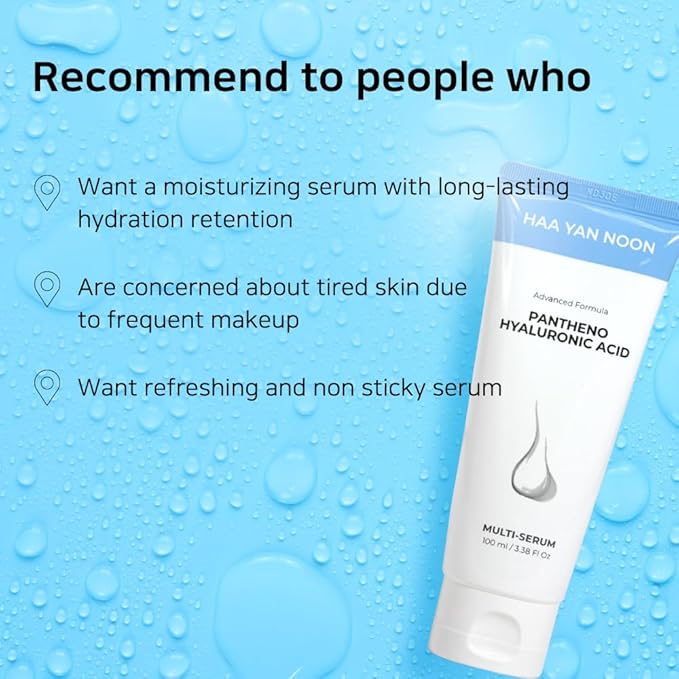 • INGREDIENTS HAA YAN NOON Hyaluronic Acid Multi Serum is formulated with 8 types of hyaluronic acid, Phanteol that help retain the skin’s natural moisture and soothe skin.