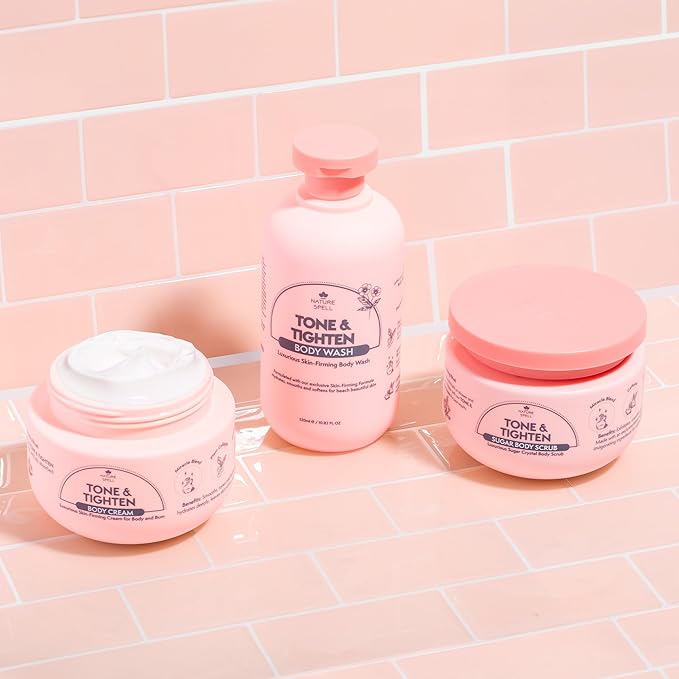 Nature Spell Tone & Tighten Skin Firming Gift Set – Body Wash, Sugar Body Scrub, & Body Cream - Skin-Firming Trio Infused with Hyaluronic Acid, Ginseng Extract & Plant Collagen