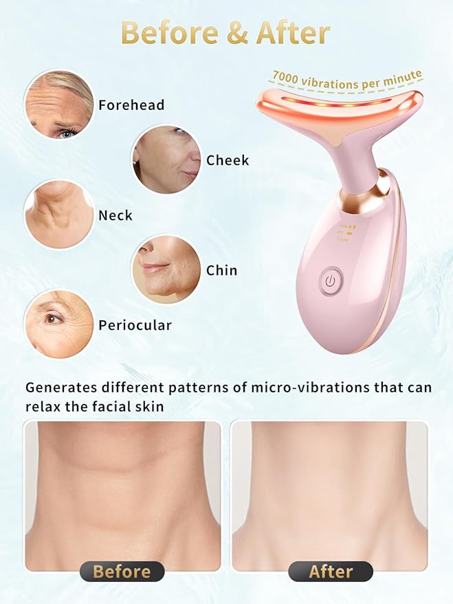 Facial Beauty Device, Multifunctional Facial Skin Care Tools with Vibration, Red and Blue LED Light, 7 Color Led Face and Neck Beauty Device for Home Use, Improve Skin(Glossy Pink)