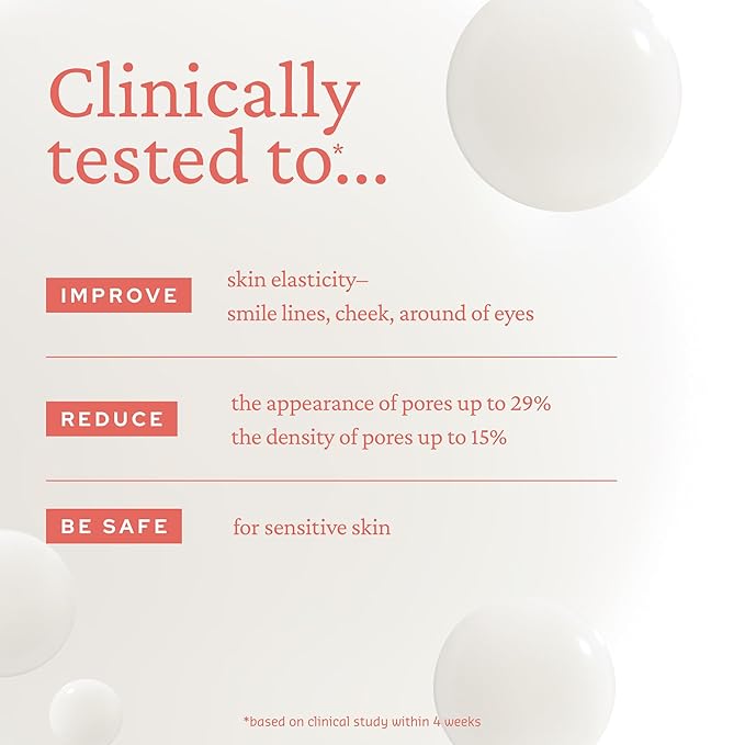 • Product Benefits : CLINICALLY TESTED TO: ● Improve skin elasticity within four weeks (including the nasolabial folds, cheeks, and the area around the eyes) ● Improve the appearance of pores up to 29% within four weeks ● Reduces the density of pores up to 15% within four weeks CLINICALLY TESTED TO: ● Improve skin elasticity within four weeks (including the nasolabial folds, cheeks, and the area around the eyes) ● Improve the appearance of pores up to 29% within four weeks ● Reduces t… See more