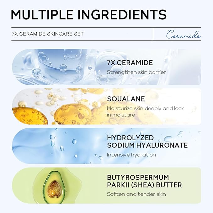 - [Enhance Skin Barrier] - Our skin care routine kit for women is rich in 7x ceramides for Daily Care, Dehydration & Dryness, Fine Lines & Wrinkles and promote moisture. We add high-quality plant ingredients such as hyaluronic acid and avocado to promote skin hydration, reduce pores, and tighten the skin