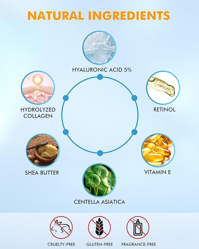 - RETINOL FACE MOISTURIZER: Our face cream is made with thoroughly selected ingredients such as retinol, hyaluronic acid 5%, and collagen which create perfect combination to restore your skin elasticity; our retinol moisturizer is non-comedogenic and does not contain alcohol, gmo, gluten and paraben.