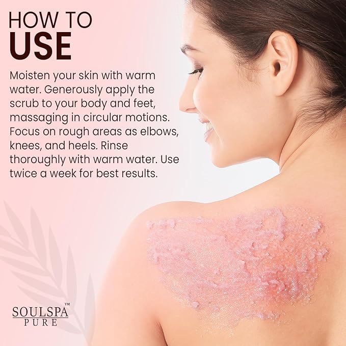 • Exfoliating Himalayan Salt: This exfoliating body scrub features natural Himalayan Pink Salt to gently exfoliate and remove dead skin cells for smooth, refreshed skin. Perfect for self-care routines and spa days. Nature powered body scrubs for women by SoulSpa Pure.