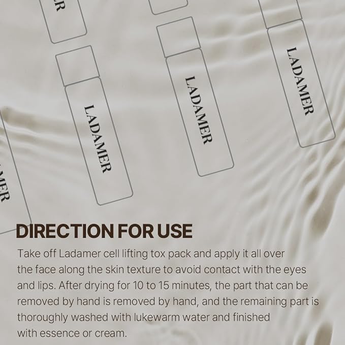 - Direction for Use: Take off Ladamer cell lifting tox pack and apply it all over the face along the skin texture to avoid contact with the eyes and lips. After drying for 10 to 15 minutes. the part that can be removed by hand is removed by hand, and the remaining part is thoroughly washed with lukewarm water and finished with essence or cream.