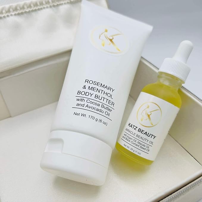 • Nourishing Skincare Set: Includes a moisturizing rosemary & menthol body butter (6 oz) and a rejuvenating miracle beauty oil (1 oz).
