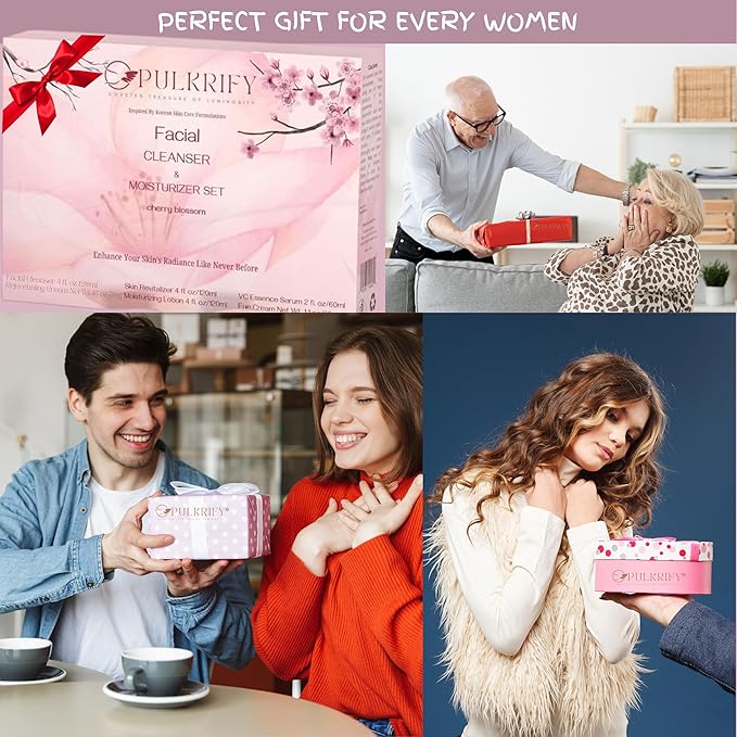 • Comprehensive Set: This 6-pieces luxury face care set from Pulkrify includes a Facial Cleanser, Moisturizing Lotion, Skin Revitalizer/Toner, VC Essence Serum, Rejuvenating Cream and Eye Cream - all infused with the delightful cherry blossom fragrance.