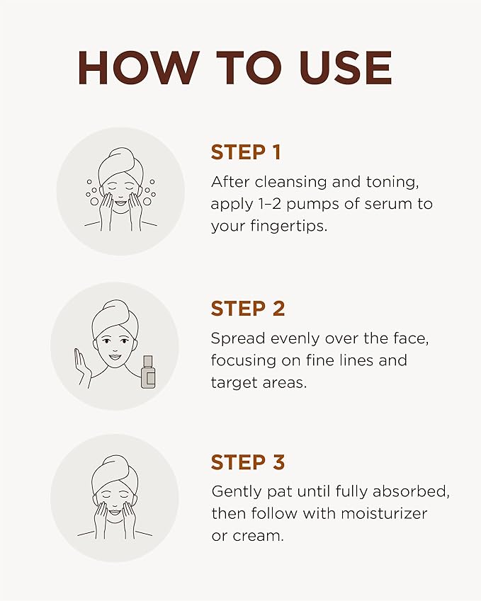 • HOW TO USE – Dispense 1-2 pumps after cleansing and toning, both morning and evening. Apply evenly over the face and focus on areas with fine lines, such as around the eyes and forehead. Pat gently until fully absorbed.