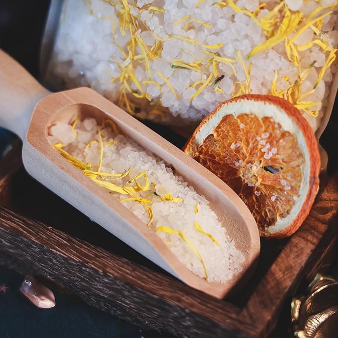 • Wooden spoon (4” long) makes it easy to scoop the desired amount of salt, and a reusable muslin bag allows for mess-free use. Simply fill the bag, drop it in warm water, and enjoy a relaxing bath with minimal cleanup.