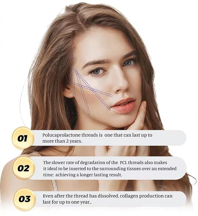 • "PCL Cog Threads" continuously produces collagen, promotes metabolism, renews aging skin, and supports the skin with a high-strength natural collagen scaffold that can resist skin aging and sagging, thereby filling up wrinkles and tissue breaks, tightening sagging skin, and restoring skin Smooth and delicate, achieve the purpose of lifting contour, firming skin, reducing wrinkles and improving skin texture