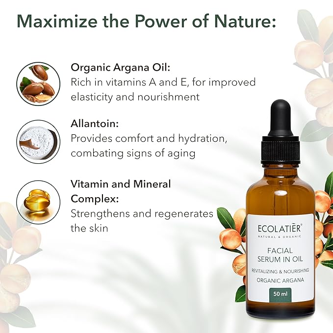 • Facial Serum: Argana oil, wheat germ oil, and vitamins reduce fine lines, improve skin elasticity, and provide deep hydration and nourishment.