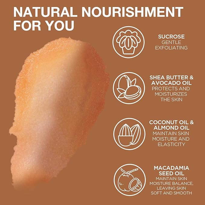 • NATURAL NOURISHMENT: Our Coffee Body Scrub is enriched with natural nutrients such as Shea Butter, Coconut Oil, Vitamin E and Coffee Seed Oil, which can effectively penetrate the skin, remove impurities, deeply nourish, leaving skin burden-free, soft, smooth and youthful.