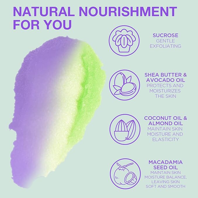 • NATURAL NOURISHMENT: Our Lavender Body Scrub is rich in natural nutrients such as Shea Butter, Coconut Oil, Vitamin E and Lavender Extract, which can effectively penetrate the skin, remove impurities, and deeply nourish, leaving skin burden-free, keeping it soft, smooth and youthful.