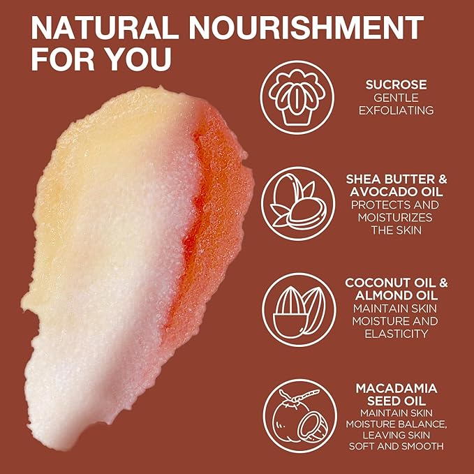 • NATURAL NOURISHMENT: Our Brown Sugar Body Scrub is enriched with natural nutrients such as Shea Butter, Coconut Oil and Vitamin E , which can effectively penetrate the skin, remove impurities, deeply nourish, leaving skin burden-free, soft, smooth and youthful.