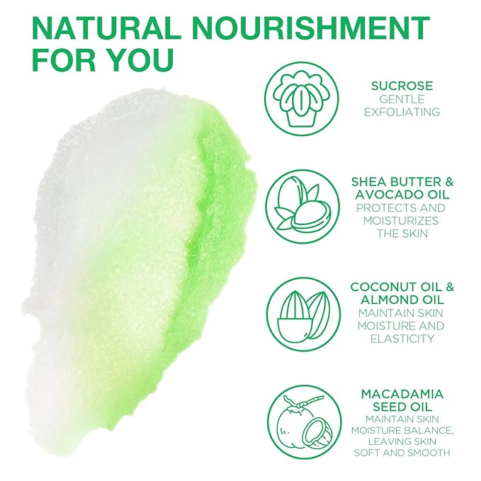 • NATURAL NOURISHMENT: Our Coconut Body Scrub is enriched with natural nutrients such as Shea Butter, Coconut Oil and Vitamin E, which can effectively penetrate the skin, remove impurities, deeply nourish, leaving skin burden-free, soft, smooth and youthful.