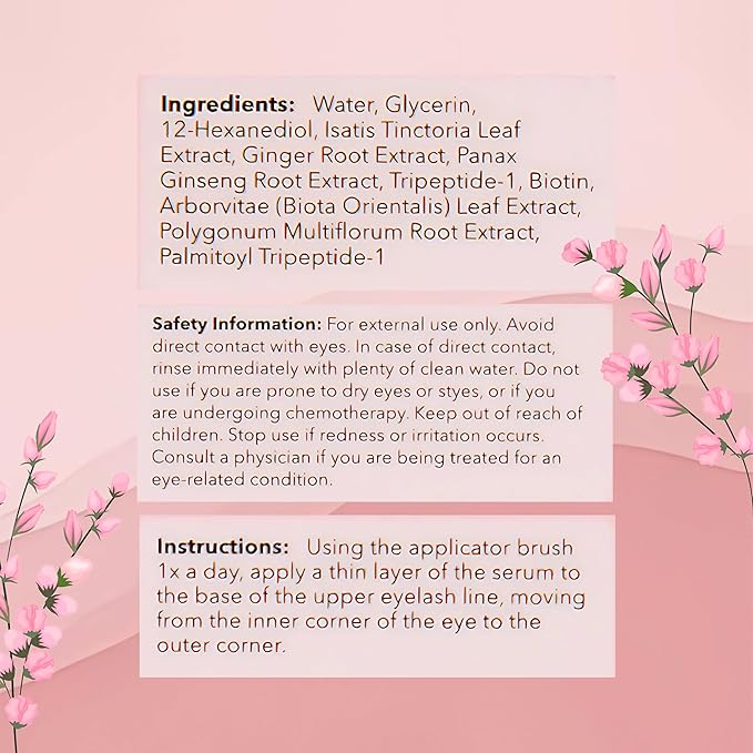 • Performance-based botanicals: Biotin, ginger root, panax ginseng root, and isatis tinctoria leaf extract stimulate longer, thicker and healthier lashes