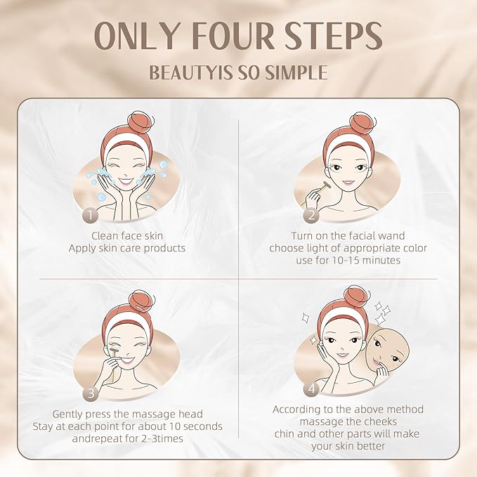 - 【7 Colors Led Beauty Wand】Red Light(630nm),Green Light(520nm),Blue Light(470nm),Yellow Light(590nm),Purple Light(390nm),Cyanine Light(415nm-520nm),White Light (Mix).