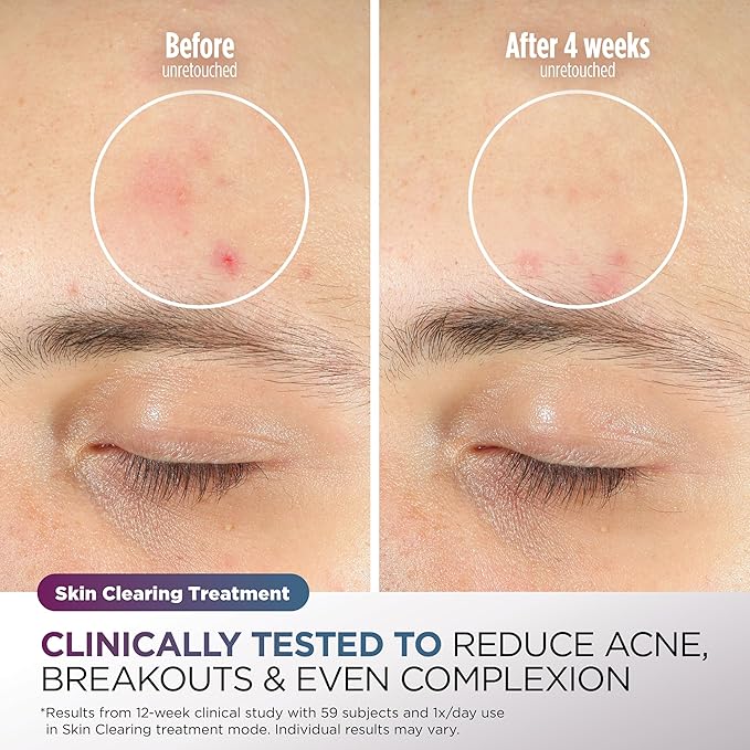 - Skin Clearing Treatment: Experience chemical-free acne-clearing with an 8-minute Blue & Infrared and Red LED session to reduce acne & redness for a more even and clear complexion**. **Results from 12-week clinical study with 59 subjects and 1x/day use in Skin Clearing treatment mode. Individual results may vary