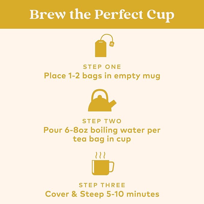 • HOW TO BREW: Place 1-2 Chamomile tea bags in an empty mug. Pour 6-8 ounces of boiling water per tea bag in cup, and cover and steep for 5-8 minutes