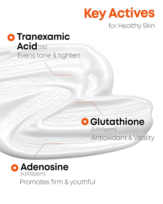 • KEY INGREDIENTS & BENEFITS: Contains 5% Tranexamic Acid to visibly reduce dark spots, 2% Niacinamide to smooth texture and calm redness, 5,000ppm Glutathione for antioxidant protection, and 4,000ppm Adenosine to enhance elasticity and skin firmness.