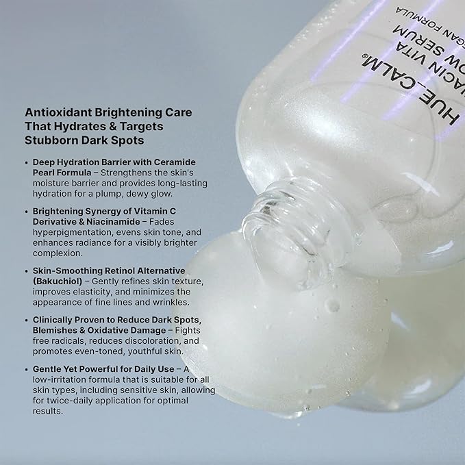- π§ Hydration-First Brightening β No More Dryness or Peeling β Many brightening serums leave your skin flaky and irritated. Hue Calm's advanced hydration technology ensures that your skin stays plump and dewy, thanks to Hyaluronic Acid serum, Squalane moisturizer, and Centella Asiatica extract. The deep-penetrating formula strengthens your moisture barrier, leaving you with a healthy glow and long-lasting hydration.