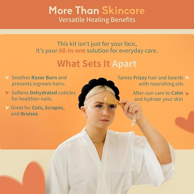 • TACKLE DRYNESS & DAMAGE: This all-in-one skincare set hydrates and revitalizes, softening scars and smoothing dry, damaged skin. Perfect for after-sun care, soothing razor burn, or rejuvenating dehydrated cuticles for a complete facial kit for women experience.