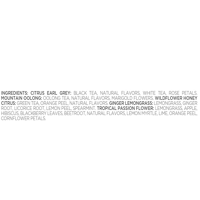 - TEA BLENDS - In this collection are crafted to evoke a sense of tropical tranquility and include: Citrus Earl Grey (Black tea), Mountain Oolong (Oolong Tea), Wildflower Honey Citrus (Green tea), Ginger Lemongrass (Herbal tea), and Tropical Passion Flower (Herbal Tea).
