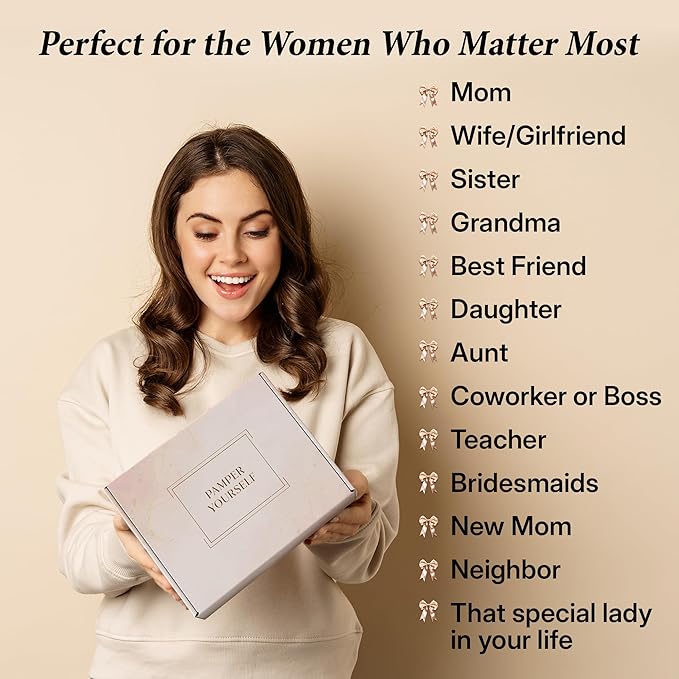 - PERFECT GIFT FOR EVERY OCCASION: Thoughtfully curated for every special moment, this spa gift box celebrates moms, grandmas, mother-in-laws, wives, sisters, teachers & best friends. Making it perfect for birthdays, mother's day, valentines, anniversaries or "just because." Offering a unique & versatile way to show appreciation. From a busy professional to a friend needing a boost, this set is a top gifts choice for women, mothers, and loved ones. It’s a delightful way to make her feel cherished.