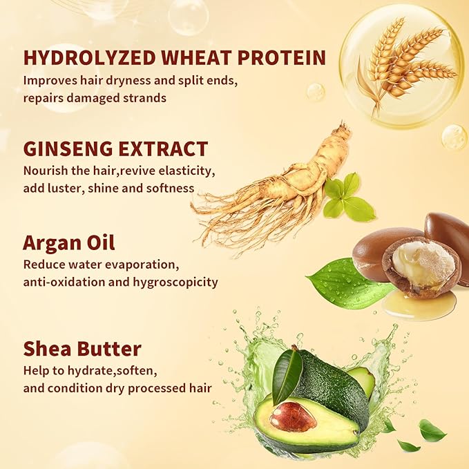 - 【Deeply Hydrate & Moisturize】This hair treatment mask is filled with Ginseng extract nourish the hair silk, make the hair dark and shiny; providing long-lasting nourishing hair from root to tip, improve moisture retention and soothe any dry and damage caused by styling, coloring or bleaching.Add shine, smoothness, softness and leave your hair soft, silky, and easier to manage