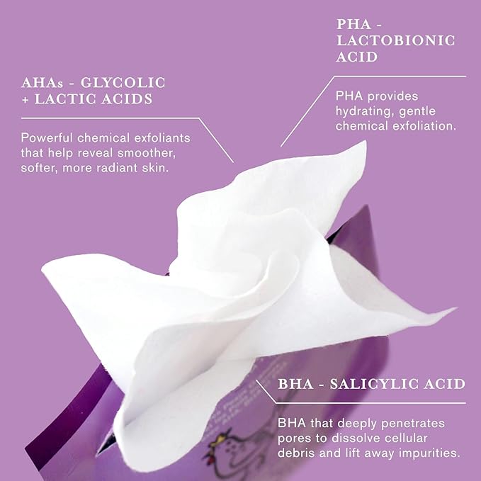 - FEATURED INGREDIENTS: Lactobionic Acid – A PHA that offers gentle chemical exfoliation while providing hydration. Glycolic + Lactic Acids – Dermatologist-recommended AHAs that deliver powerful, multilevel exfoliation, revealing smoother, softer, and more radiant skin. Salicylic Acid – A BHA that deeply penetrates pores to dissolve cellular debris and remove impurities. Linoleic + Linolenic Acids – Essential fatty acids that help restore the skin barrier and soothe sensitivity.