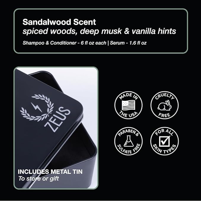 • MADE IN USA: The Essential BeardPLUS Kit, featuring our signature Sandalwood fragrance, includes: (1) 6 oz. BeardPLUS Shampoo, (1) 6 oz. BeardPLUS Conditioner, and (1) 1.6 oz. BeardPLUS Serum Oil, all packaged in our classic ZEUS Gift Tin.