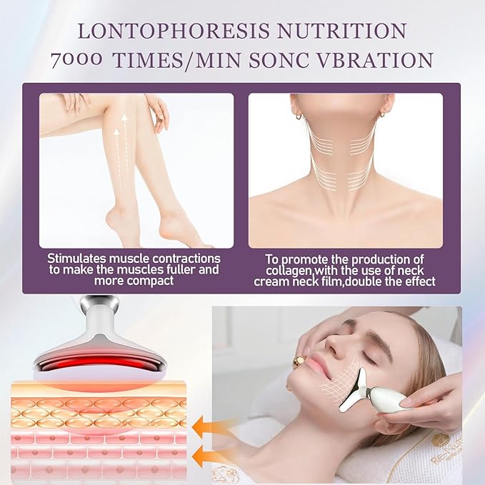 - 【Revitalization and relaxation】Our facial and neck skin care massager has seven color modes. It decomposes and reintroduces nutrients through electric ions, which helps to promote the absorption of face cream and lotion. High frequency sound waves vibrate evenly and continuously to stimulate muscle vitality, dredge the meridians, and thus relieve neck muscles. Very suitable for relieving stress, keeping you in a relaxed and elegant posture at all times.