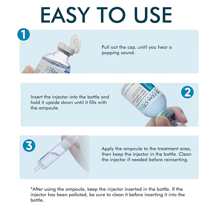 • EASY TO USE: After cleansing and toning, apply 3 - 5 drops of the stem cell serum evenly over the face and massage gently until fully absorbed, integrating perfectly into your daily skincare routine