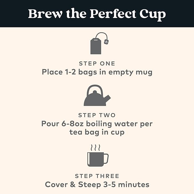 • HOW TO BREW: Place 1–2 teabags in a mug. Add 6–8 oz of boiling water per bag. Cover and steep for 3–5 minutes. Enjoy on its own or customize with milk and sweetener