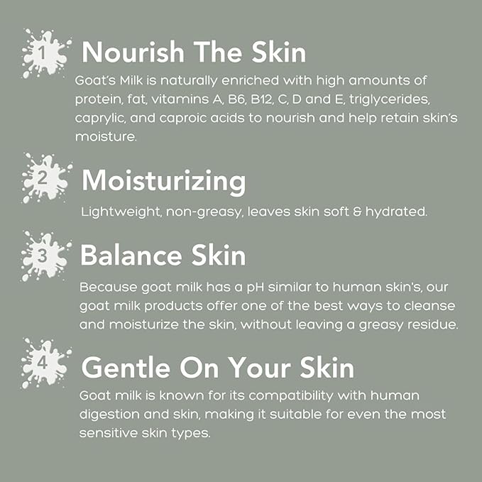 • Goat Milk Nourishment: Packed with protein, fat, and vitamins, goat milk deeply hydrates and softens skin with a pH similar to human skin for fast absorption and zero greasy residue.