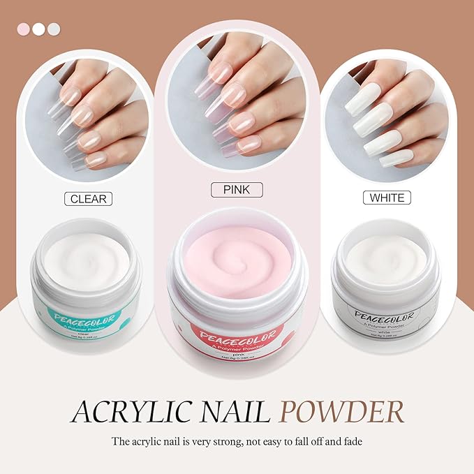 • Acrylic Nail Kit for Beginners:This acrylic nail kit includes 3pcs basic acrylic powder(Clear,White,Pink), 30ml acrylic liquid, Nail Brush, 20PC Nail Forms, Glass Cup, and Nail File. You can enjoy doing your nails at home with this acrylic nail kit without going out to the nail salon.