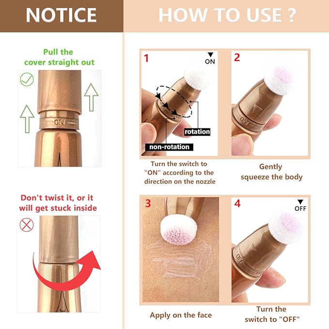 - 【How to Use】1. Pull the cap straight out (don't twist it, or it will get stuck inside) 2. Turn the switch to "ON" according to the direction on the nozzle. 3. Gently squeeze the tube to dispense an appropriate amount of face cream and lock the liquid through the air cushion applicator, and turn the switch to "OFF". 4 Apply the cream highlighter to desired locations and blend with fingertips or a brush.